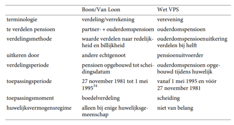 12. Het regime voor de verevening van pensioenrechten volgens het arrest Boon-Van Loon verschilt aanzienlijk van het regime voor de verevening van pensioenrechten volgens de Wet VPS en niet alleen wat betreft de vorderingsrechten. Diegene waarop het zogeheten Boon-Van Loon-arrest van toepassing is, is naar het oordeel van de rechtbank dan ook niet gelijk aan diegene die onder de vigeur van de Wet VPS zijn gescheiden. Eisers beroep faalt dus reeds omdat geen sprake is van gelijke gevallen.”